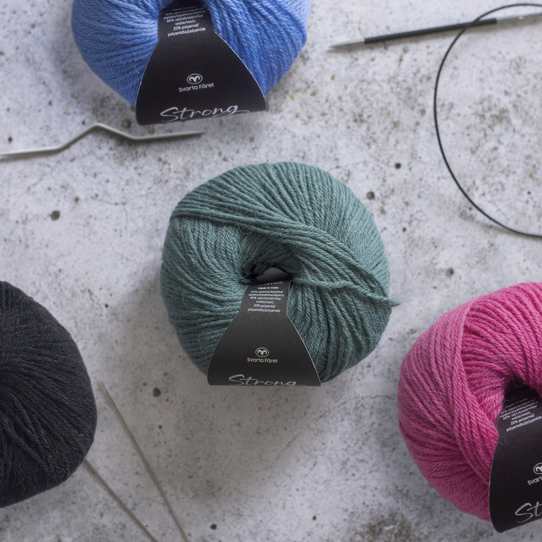 Strong från Svarta Fåret är ett mjukt och värmande ullgarn av alpacka, ull och lite polyamid för hållbarhet. Detta sköna garn passar perfekt när du vill sticka plagg och accessoarer som håller dig varm under den kallare delen av året. Alpackaullen gör garnet fluffigt och vackert - och Strong passar även fint i sockor!
